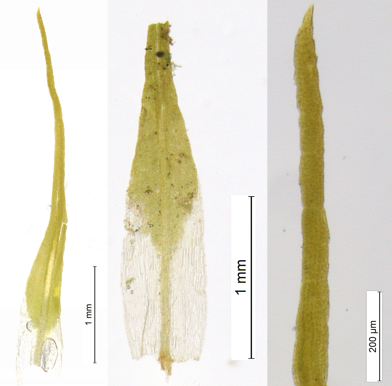 Helt blad. Blad med avbrekt bladspiss og kvit bladbasis. Bladspiss med innsnevringer, som er soner hvor den lett brekker.