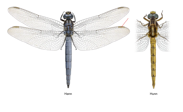 Utfarget hann av småblålibelle Orthetrum coerulescens. Hannen kan kjennes på den blå bakkroppen, de gulbrune vingemerkene og den klare vingebasisen.