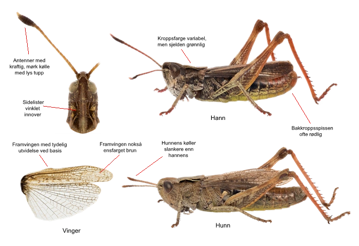 Middels stor art med kølleformede antenner. Kroppsfargen varierer sterkt i nyanser fra brunt og grått til nesten rødrosa. Grønne fargevarianter er uvanlige. Framvingene er forholdsvis ensfarget brune. Baklårene er vanligvis oransje eller gulaktige, og bakkroppen ofte rødlig. Begge kjønn har lange antenner med en tydelig kølle på enden. Køllen er mørk med lysere tupp. Den er tydeligst hos hannen, noe mindre utviklet hos hunnen. Ryggskjoldet har både sidelister og midtkjøl. Sidelistene er vanligvis tydelig vinklet innover i framre halvdel av ryggskjoldet, sjeldnere jevnt buet innover. Vingene er fullt utviklet og rekker vanligvis bak til bakkroppsspissen, gjerne litt lenger hos hannen. Framvingens framkant er utvidet ved basis som hos Chorthippus-artene. Hannen har 140–240 stridulasjonstapper, hunnen har 130–200 stridulasjonstapper.
