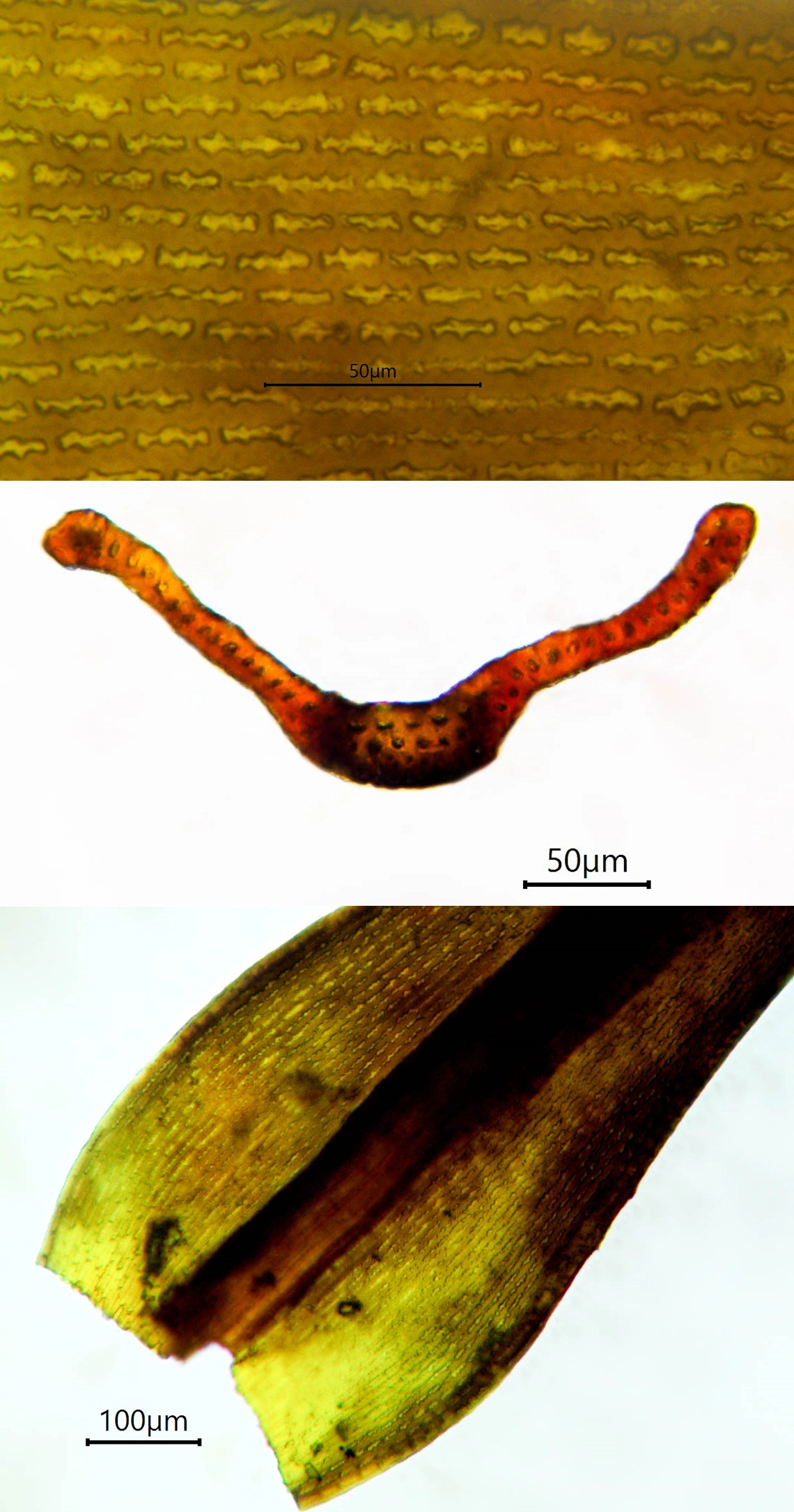 Over: Cellestruktur i bladplata, legg merke til de tykkveggete cellene. Midten: Tverrsnitt av blad. Under: Bladbasis.