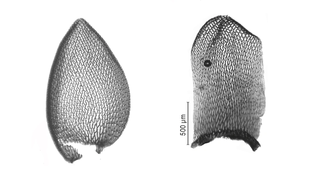Smalt eggformet greinblad (til venstre) og smalt rektangulært stengelblad (til høyre).