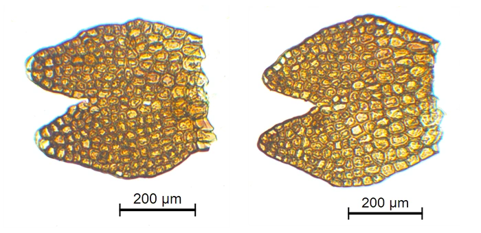 Celler i bladmidten har jevnt fortykka cellevegger uten tydelige trigoner.