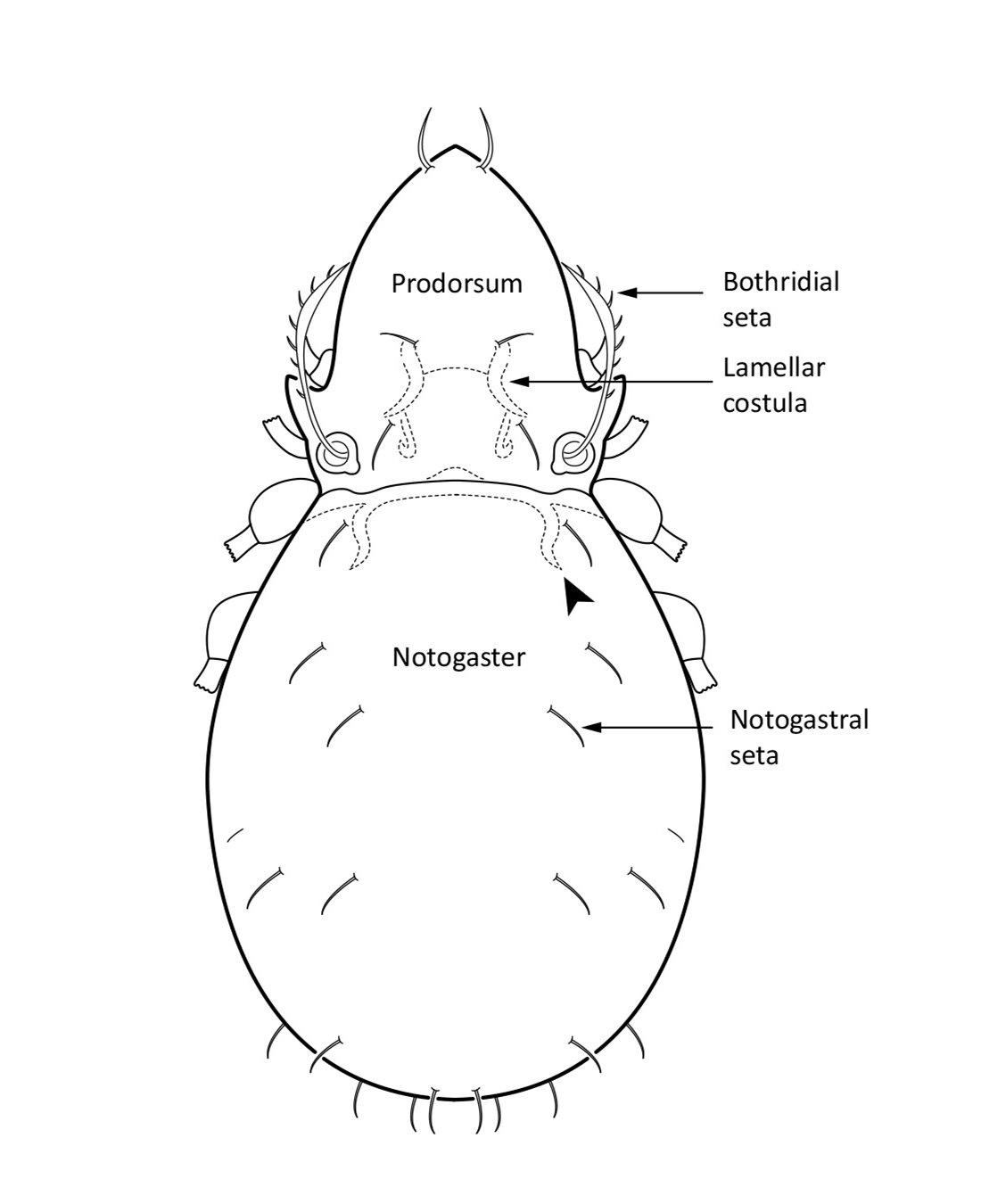 Adult: The length of the body is 220–357 µm, and the width is 130–186 µm. The color is light brown. The prodorsum has distinct parallel lamellar costulae (longitudinal ridges similar to lamellae, but without projecting edges or cusps), extending diagonally to the bothridial setae (Fig. 1). There is a transversal ridge between the parallel costulae. The bothridial seta is long, very slim, spindle-shaped, and with small cilia on one side. The notogaster has two pairs of cristae (marked by arrowhead in Fig. 1) at the anterior margin, and 10 pairs of short setae.