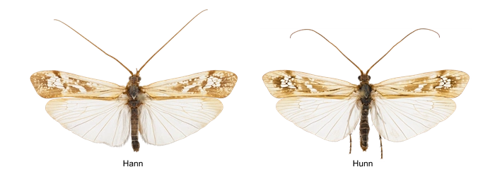 Framvinge hann: 14,8–19,8 mm, framvinge hunn: 15,1–19,9 mm.